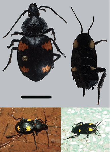 Une blatte non encore identifiée vient de faire l’objet d’une publication dans l’Entomological Science : il s’agit d’une blattinae présente au Viet Nam dont le modèle est un carabe, Craspedophorus sublaevis , fort présent au Cambodge et Viet Nam. Ce carabe possède des glandes secrétant un liquide anti-prédateur ce qui le rend particulièrement intéressant à imiter ! Ainsi, la blattinae arbore comme son modèle une couleur uniformément noire avec 4 points jaunes ..